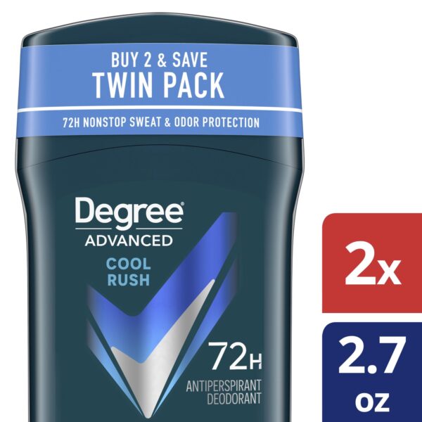 Degree Advanced Long Lasting Antiperspirant Deodorant Stick Twin Pack, Cool Rush, Freshen up, power up and move with confidence with Degree Men Cool Rush Antiperspirant Deodorant. Supercharged with 72-hour sweat and odor protection, this Antiperspirant deodorant for men works as hard as you do and provides superior motion-activated protection from sweat and odor. However you move, this Antiperspirant deodorant delivers unstoppable freshness for that shower-clean feeling all day long. With a refreshing, crisp, arctic scent and non stop odor and sweat protection, this Degree Men Antiperspirant deodorant will not let you down, so you can stay fresh, for all the ways you move. Our Motionsense technology does not stop working no matter how much you move. It works with unique micro-capsules that sit on the surface of your skin. This powerful Antiperspirant deodorant responds when you need it most so that you can stay confident without having to worry about slowing down.