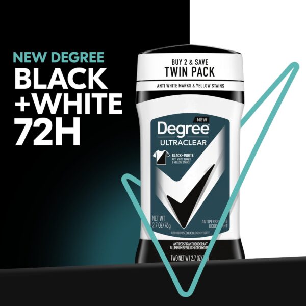 - WHITE SHIRT, BLACK SHIRT, NO PROBLEM: Degree Ultra Clear Black+White Antiperspirant Deodorant delivers 72-hour sweat and odor protection with anti-white marks and anti-yellow stains technology