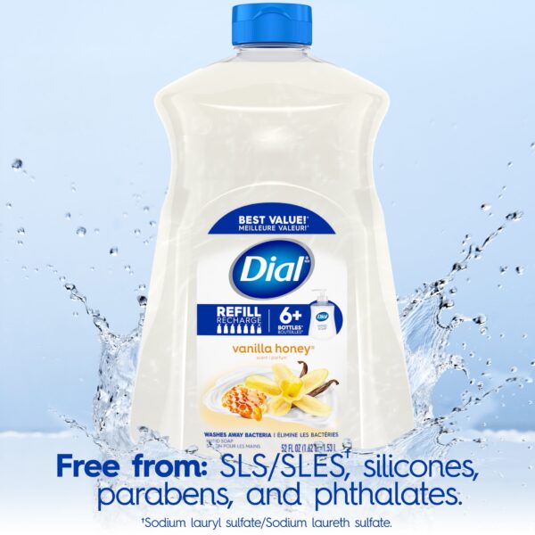Enjoy the fresh scent of Dial Vanilla Honey hand soap refill. Includes enough product to refill over 6 Dial hand soap bottles†. This hypoallergenic formula washes away bacteria while being gentle on skin, leaving it feeling soft, smooth, & healthy. Dermatologist tested & approved as cruelty free under the Leaping Bunny program. This package contains 52 fluid ounces of Dial hand soap. †Refills 6.9 Dial Liquid Hand Soap 7.5 fl oz Bottles