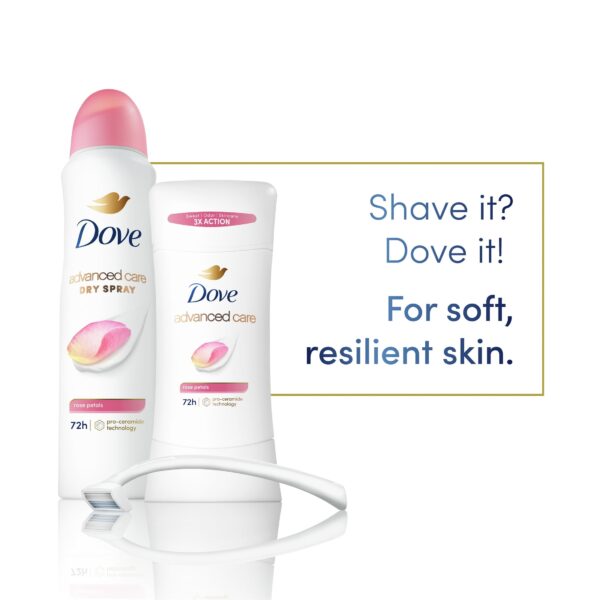 Dove Advanced Care Women’s Antiperspirant Deodorant Stick Rose Petals, 2.6 oz. Beautifully soft, resilient skin after shaving has arrived. Introducing Dove Advanced Care Rose Petals Antiperspirant Deodorant Stick, the everyday essential that hel repair your skin barrier after shaving with every use. Infused with a delicate floral scent of rose petals, alongside warm sandalwood and juicy peach notes, this antiperspirant uplifts and energizes you as you go about your day. Did you know that when you shave, ⅓ of what you remove is skin? That’s why Dove’s Advanced Care antiperspirant deodorant range features innovative Pro-Ceramide Technology that boosts ceramide levels in your skin, which are essential for maintaining a strong skin barrier. This boost of ceramides hel your underarm skin barrier to recover after shaving. For adult use.