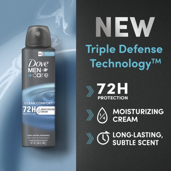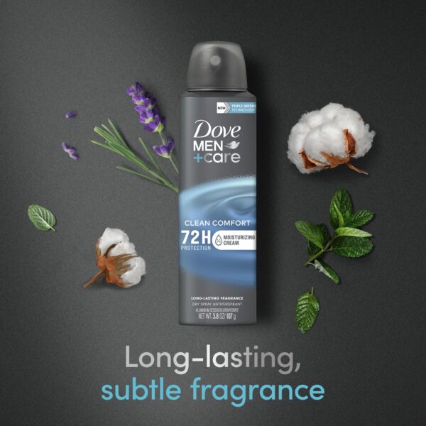 - TRIPLE DEFENSE TECHNOLOGY: Dove Men’s Deodorant Spray offers powerful 72h odor & wetness protection, long-lasting subtle scent, and 1/4 moisturizing cream to give you comfortable underarms