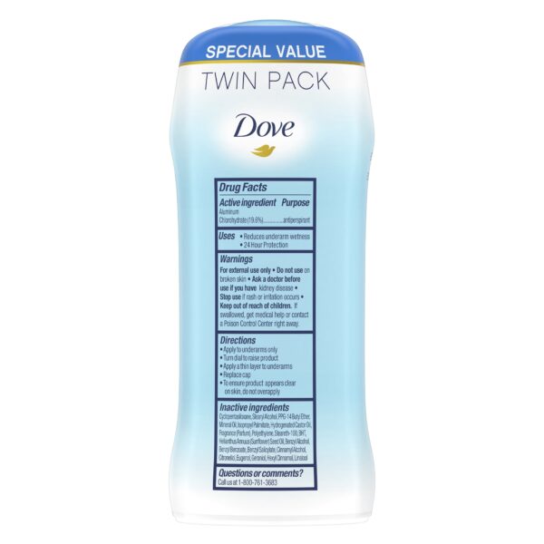 Get a fresh, clean feeling from your antiperspirant deodorant with Dove Invisible Solid Antiperspirant Deodorant Original Clean 2.6 oz, Twin Pack. A deodorant stick with our signature clean scent, it glides on easily and offers up to 24 hours of antiperspirant protection against sweat. Caring to skin, the alcohol (ethanol) free formula contains Dove ¼ moisturizers to provide great underarm care. This antiperspirant deodorant also helps skin to recover from shaving irritation so that you can enjoy underarms that look and feel softer and smoother. Dove Original Clean is a great antiperspirant for those who love solid deodorants and the familiar, original scent of Dove. Protecting you from sweat for up to 24 hours, this antiperspirant deodorant glides on easily and gives you a fresh start to the morning. For great results use Dove Original Clean after bathing or showering, once skin is cool and dry. Swipe the deodorant stick up and down each underarm two or three times until an even layer is applied to the skin. Enjoy the clean, original scent of Dove and the reassurance that comes with up to 24 hours of protection from your Dove Original Clean. At Dove, our vision is of a world where beauty is a source of confidence, and not anxiety. So, we are on a mission to help the next generation of women develop a positive relationship with the way they look – helping them raise their self-esteem and realize their full potential.