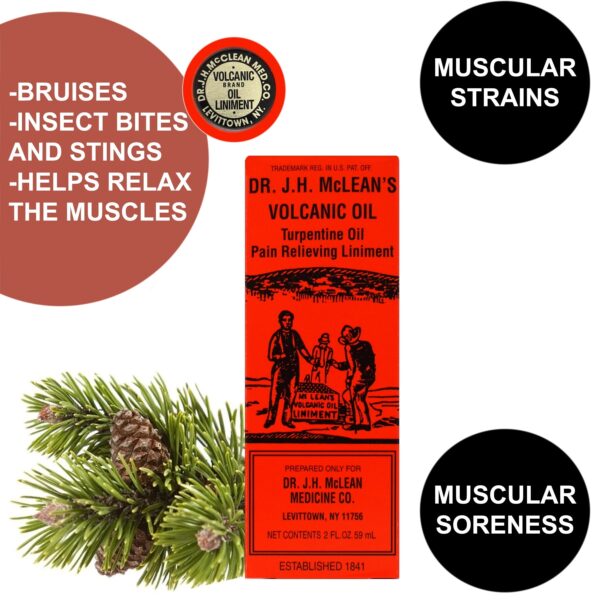 - Dr. J.H. McLean’s Volcanic Oil is a turpentine-based liniment that aids in quick & temporary relief of pain & discomfort of minor muscular strains, bruises & aches.