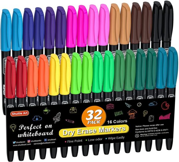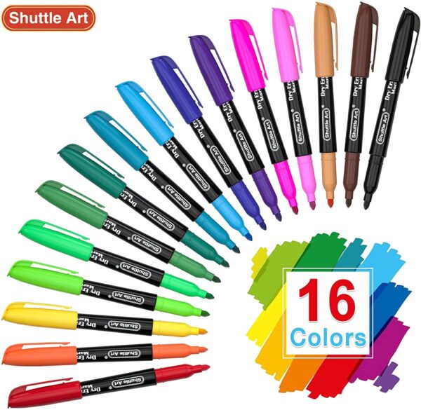 - 16 COLORS FINE TIP: Shuttle Art 16 colors dry erase markers contains 16 different colors fine tip dry erase markers. With durable bright ink easily to read markers in the classroom or council chamber.