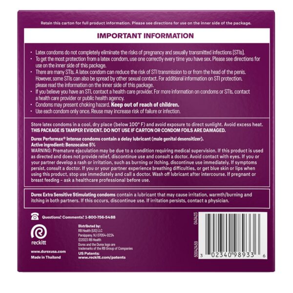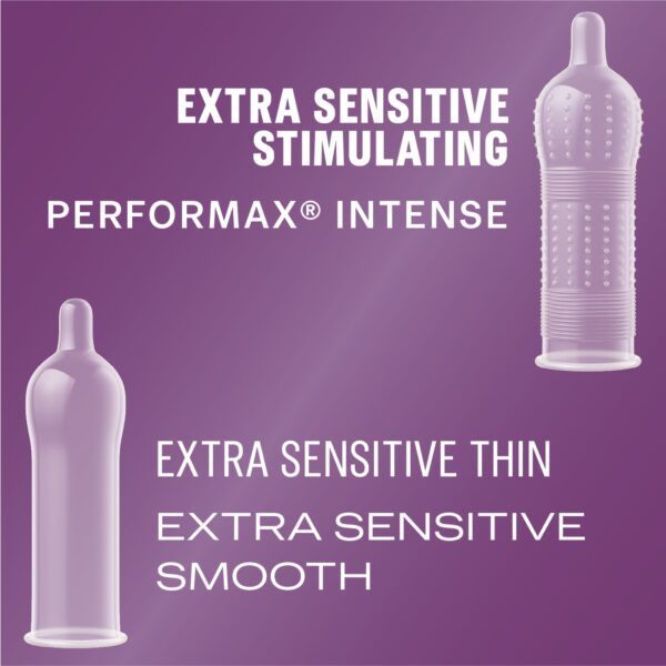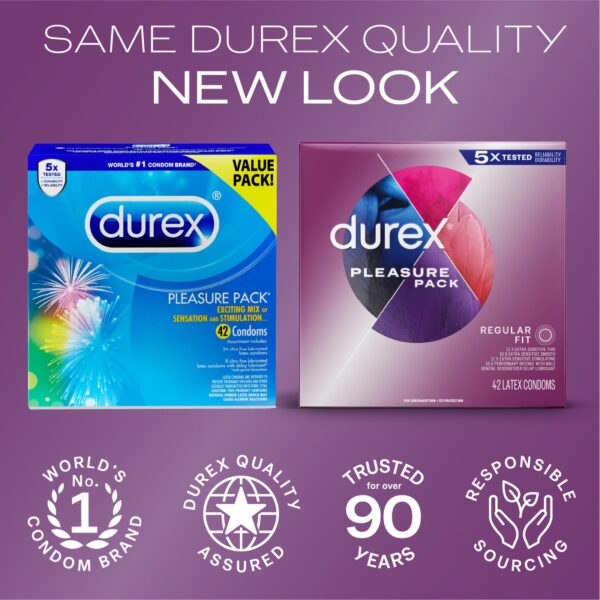 - DUREX CONDOM PLEASURE PACK: Features 4 types of assorted lubricated, natural latex male condoms including Extra Sensitive condoms & Performax Intense condoms