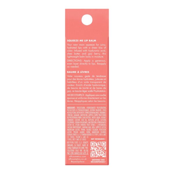 Meet e.l.f. Cosmetics Squeeze Me Lip Balm, your new favorite lip product for hydrated and nourished lips. This moisturizing leave-on lip balm helps hydrate with a sheer tint of color and is enriched with lip-loving ingredients like hyaluronic acid, shea butter, and goji berry. Perfect for getting a boost of moisture with a sheer tint of color wherever you are.