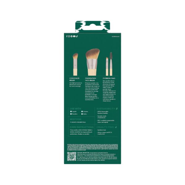 The EcoTools Conceal, Enhance + Sculpt Brush Trio brings you 3 eco-friendly makeup brushes for the makeup minimalist- embrace a more natural you. This brush kit includes the Concealer Brush, Foundation Face Brush, and Eyebrow Duo. Both the concealer and foundation brush are best used with liquid, cream, and stick formulations. The eyebrow brush can be used with brow creams, gels, and powders. Each face brush has densely packed bristles to blend liquid and cream formulas with curved edges to get into hard-to-reach places. Superior performance made sustainable. Our makeup brushes are made with 100% renewable bamboo handles, aluminum ferrules, and soft, synthetic brush hair. As with all our EcoTools products, this brush set is 100% cruelty-free and vegan. The Conceal, Enhance + Sculpt Brush Trio is easy to clean with our EcoTools Brush + Sponge Shampoo for improved brush performance.