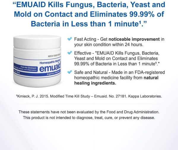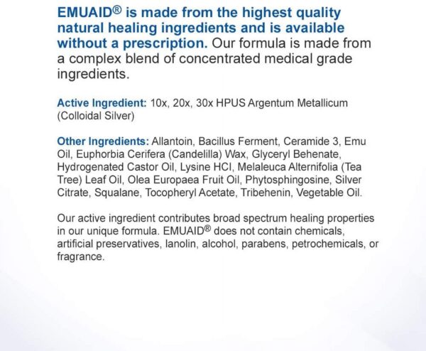Emuaid Natural Pain Relief, Argentum Metallicum, Anti-Inflammatory Therapy, 2 Oz. EMUAID is a groundbreaking, scientifically-based, modern homeopathic topical treaent engineered with natural healing ingredients and rare growth factor stimulators that work synergistically to immediately soothe irritation, dramatically reduce inflammation, treat a variety of disorders and heal damaged and resistant skin conditions. SAFE Safe for all ages, EMUAIDis recommended by doctors and trusted by consumers. NATURAL The natural ingredients in EMUAIDassist the body in activating its self-healing powers to safely fight the most powerful bacterial, fungal and viral skin conditions.