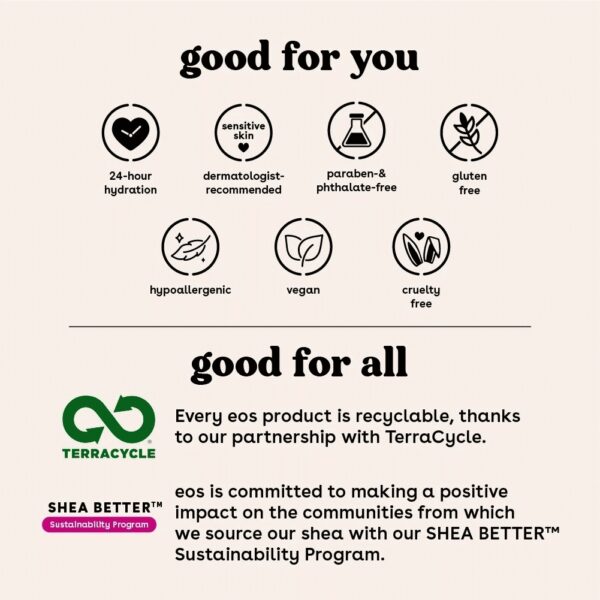 - ALL-NATURAL SHEA BUTTER: eos products have wild grown, sustainably-sourced 100% natural shea butter to make skin feel moisturized, protected and soft. We are paraben, phthalate and gluten free. Dermatologist-recommended. Vegan. Hypoallergenic. Cruelty-free.