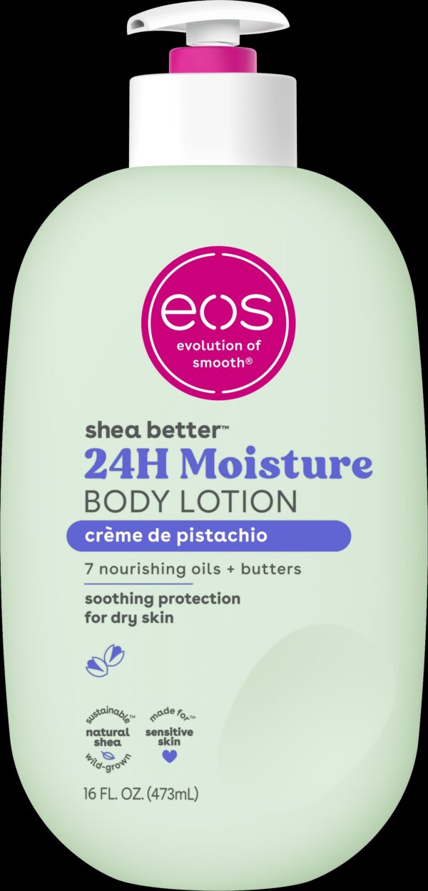 Our feminine and creamy Creme de Pistachio Body Lotion features notes of toasted pistachio, vanilla toffee, and blonde woods. eos 24H body lotion with instantly moisturizing Shea Oil + lasting protection Shea Butter quickly absorbs for 24-hour hydration. Say hello to… fast-absorption, lightweight, soft skin, and sustainable shea. Say goodbye to… greasiness, heaviness, and sticky residue. Apply this fast-absorbing and deliciously scented body lotion to just-cleaned skin, paying special attention to dry, rough areas. Relax – we’ll do the rest.