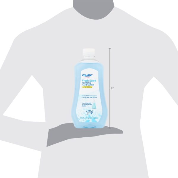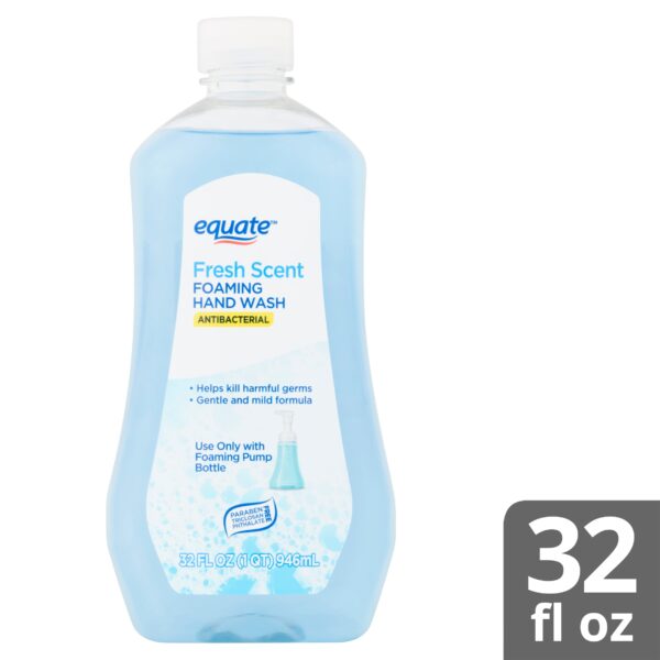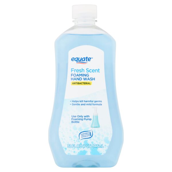 Keep your hands germ-free and smelling wonderful with Equate antibacterial fresh scent foaming hand wash. This 32 fl oz bottle of antibacterial hand wash is designed to refill foaming pump bottles. This delightfully scented wash is the perfect soap to keep at every sink in the house, so family and friends will always be protected against germs. This formula is gentle and mild enough for the most sensitive skin and won’t leave your skin dried out. Keeping sickness-causing germs out of your house has never been easier. Just wet your hands, apply a palmful of wash to your hands, scrub thoroughly and rinse.