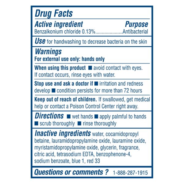 - Drug Facts. Active ingredient – Purpose, Benzalkonium chloride 0.13% – Antibacterial
