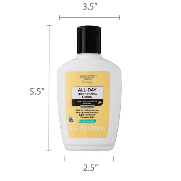 Achieve hydrated, healthy-looking skin with Equate Beauty All-Day Moisturizing Lotion for Sensitive Skin, SPF15, the ultimate daily moisturizer designed for sensitive skin. This lightweight, non-greasy formula provides 8 hours of hydration, leaving your skin smooth and radiant without clogging pores. With Vitamin E and soothing aloe, it moisturizes skin while delivering broad spectrum SPF 15 UVA/UVB protection to help guard against sun damage and early signs of aging. Dermatologist-tested and safe for sensitive skin, this lotion is alcohol-free, phthalate-free, PABA-free, and free of fragrances, formaldehyde-donors, oxybenzone, and octinoxate. Perfect as a facial moisturizer, it promotes hydration and sun protection all in one gentle formula.