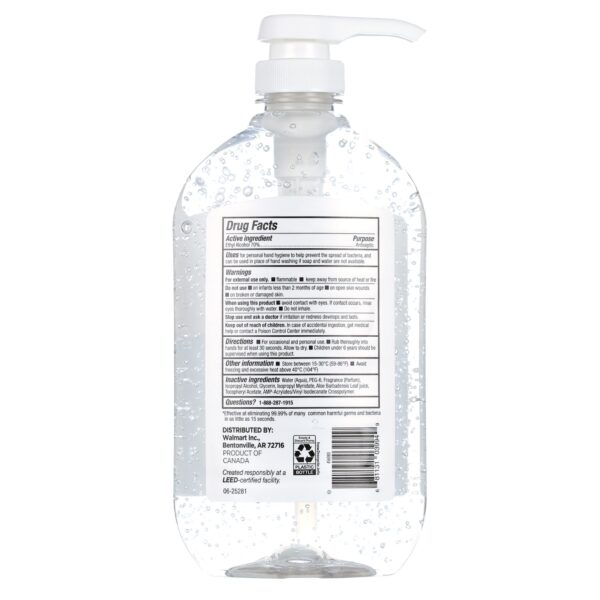 Equate hand sanitizer: Works great. Clean smell, but not overpowering (we are a family of many allergies)… much better than other brands that way, IMHO. The large refill is currently a better deal and works out great for reuse of the original pumps which are uncommonly good. We keep one in the car and one in the house at each bedside.
