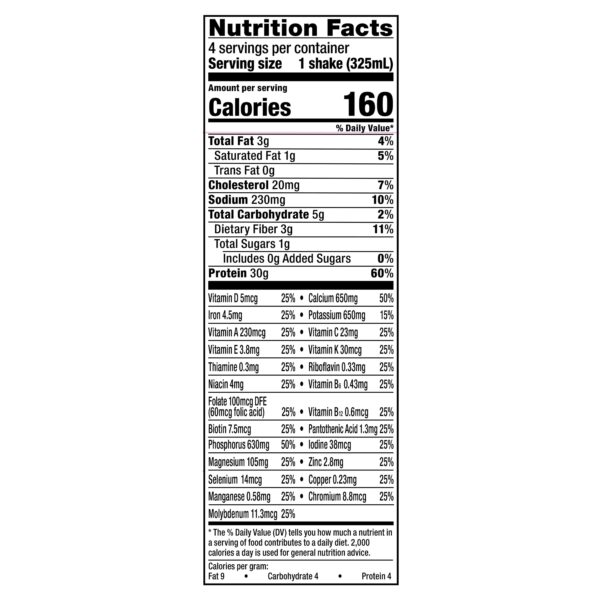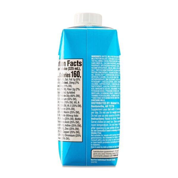 Keep this Equate High Performance Protein Shake handy for a satisfying drink. The chocolate flavor gives it a sweet and rich taste to enjoy. Each shake is packed with nutrients, including 30g of protein and 24 vitamins and minerals per serving. They’re also a good source of iron, calcium and vitamin D. With only 1g of sugar in each serving, it can be a safe choice for a low-sugar diet. Thanks to its gluten-free formula, individuals who are sensitive to gluten can enjoy this delicious chocolate protein shake as well. It comes ready to drink right away without the need for any extra prep work and contains enough nutrients to take the place of an entire meal. Grab an Equate High Performance Protein Shake when you need to curb hunger and satisfy appetite quickly and conveniently.