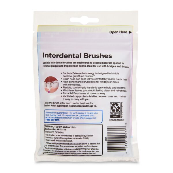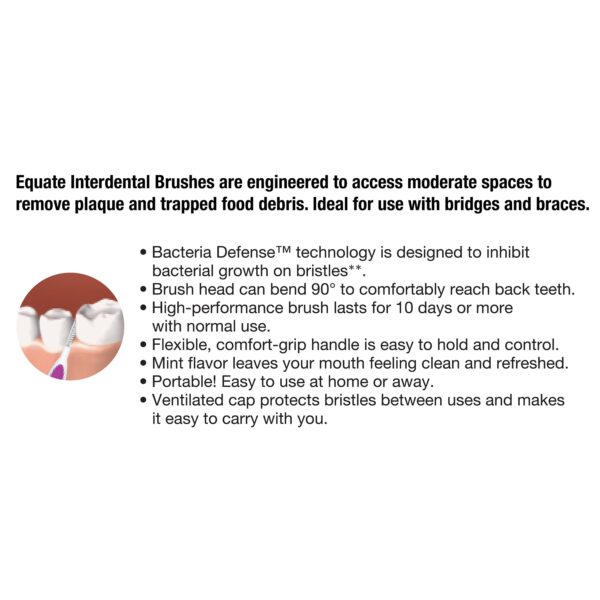 - COMPARE TO: Dentek Easy Brush; contains 20 Equate Mint Interdental Brushes for moderate teeth spacing