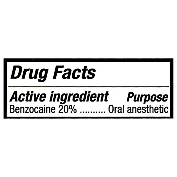 - Active ingredient: Benzocaine 20% (oral anesthetic)