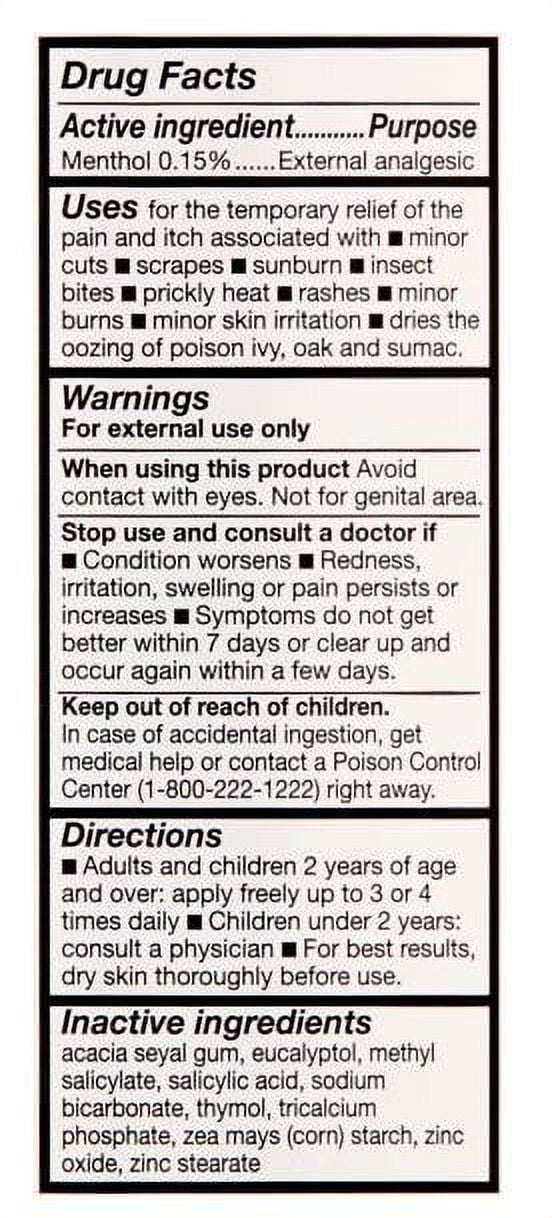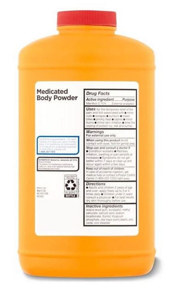 Equate Medicated Body Powder is your solution to skin irritation. It provides three times the healing relief, relieves itching, cools your skin, and absorbs moisture. It can be used for the temporary relief of pain and itch associated with minor cuts, scrapes, sunburn, insect bites, prickly heat, rashes, minor burns, and minor skin irritation. It also helps to dry the oozing of poison ivy, poison oak, and sumac. When you need relief, apply freely up to three or four times daily. Need other personal care items? Check out other Equate products like alcohol wipes, mobility aids, and over-the-counter medications. Relieve your skin irritation with Equate Medicated Body Powder.
