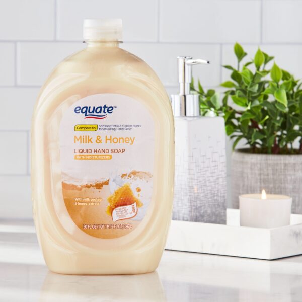 Equate Milk & Honey liquid hand soap I love this milk & honey liquid hand soap it so creamy and thick it feels velvety in your hands. The smell is wonderful too. It does a great job of cleaning your hands. The price is nice tonight bang for your buck compared to other name brand items. I would definitely recommend this product.