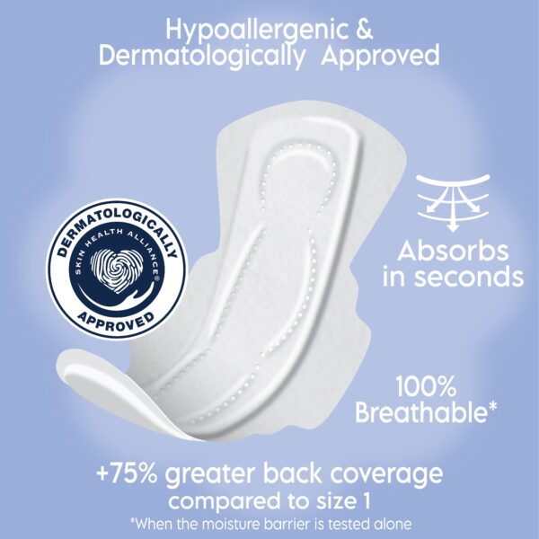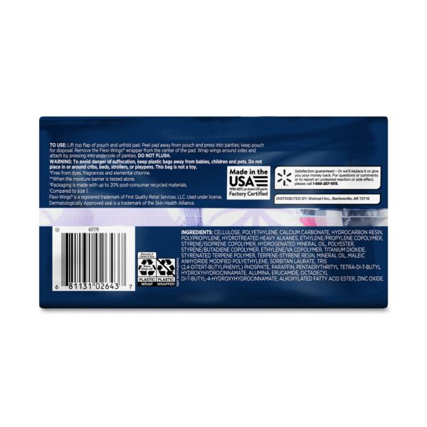 Equate Maxi Pads with Flexi-Wings absorb in seconds for worry free protection that keeps you comfortable throughout the day. These maxi pads have a 100% breathable backsheet* that allows you to stay fresh. (*when the moisture barrier is tested alone.) They have a soft embossed cover that helps maintain skin health and is dermatologically approved by the Skin Health Alliance. Perfect for your postpartum needs, they come individually wrapped for convenient and discreet access in your purse, gym bag, or cosmetic bag. These size 5 maxi pads have 75% greater back coverage compared to size 1 for extra protection at night. Plus, they’re available in sizes 1-5 to help you find the right pad for your flow. Get the protection you need with Equate Maxi Pads with Flexi-Wings.