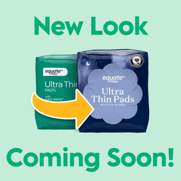 Equate Ultra-Thin Pads with Flexi-Wings have a super absorbent core to help lock away wetness. These Ultra Thin pads offer long lasting protection to help you feel confident day and night. Equate Ultra Thin pads are dermatologically approved by the Skin Health Alliance for skin health. These ultra-thin pads with wings come individually wrapped for convenient and discreet access in your purse, gym bag, or cosmetic bag. Equate Ultra Thin pads are available in sizes 1-5 to fit your flow. Size 5 Ultra Thin pads have 75% greater back coverage compared to size 1 for more protection at night.
