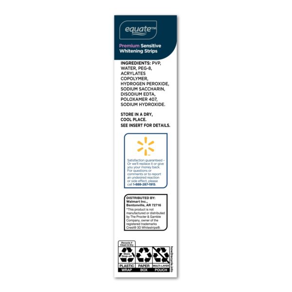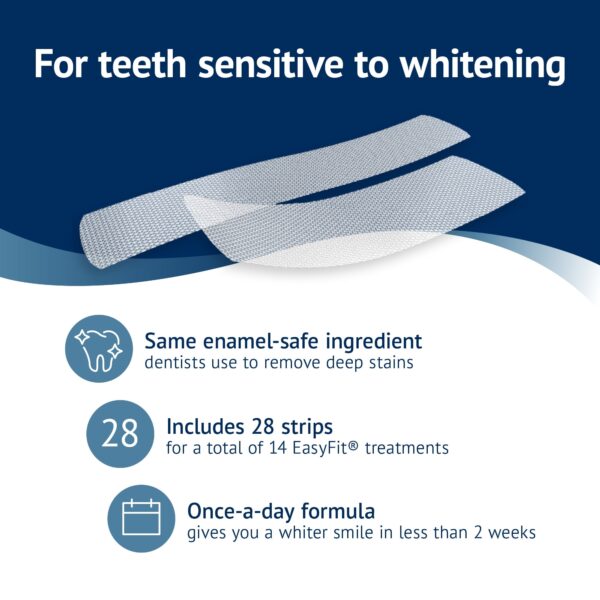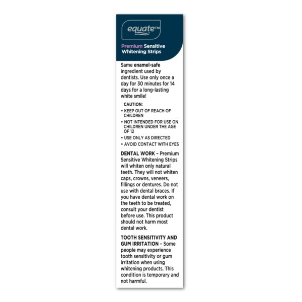 Compare to Crest 3D White No Slip Whitestrips, Gentle Routine. Remove years of tough coffee, wine and smoking stains with Equate Premium Sensitive Teeth Whitening Strips. Each pack contains 14 EasyFit treatments that are safe for your enamel. The strips were designed with a slip-free, dry touch formula for easy application. These teeth whitening strips will only whiten natural teeth and will not whiten caps, crowns, veneers, fillings or dentures. For optimal results, use only once a day for 30 minutes for 14 consecutive days for a long lasting white smile. Your teeth have never shined brighter! Because happy teeth make for a clean, bright smile.