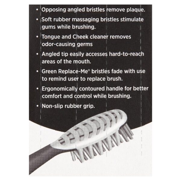 - Opposing angled bristles to remove plaque and soft rubber massaging bristles to stimulate gums while brushing