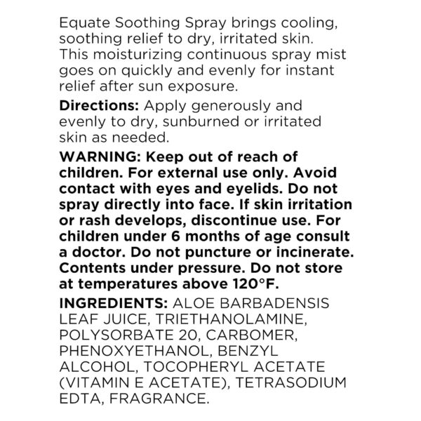 - Equate Soothing Spray Continuous Mist with Aloe, 6.3 oz