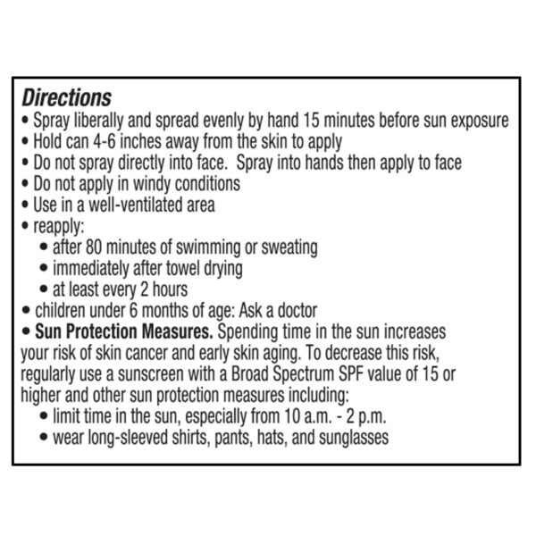 - Spray liberally and the spread evenly with hands 15 minutes before sun exposure
