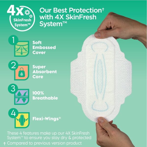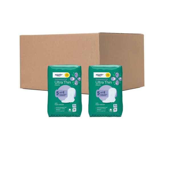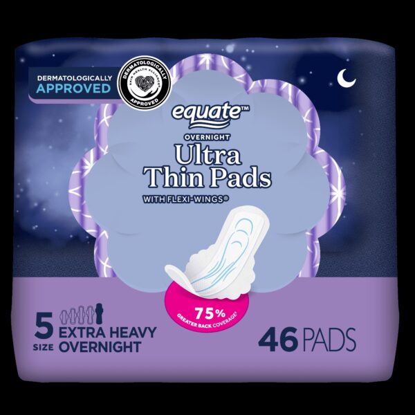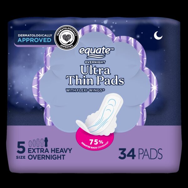 Equate Ultra-Thin Pads with Flexi-Wings stops leaks up to 10 hours with the help of three layers of protection. 68 Count includes 2 bags of 34. These Ultra Thin pads offer our best protection with 4X Skin Fresh System. The absorbent core allows you 10 hours of worry free protection and has a soft embossed cover that wicks away moisture for healthy skin. These ultra thin pads with wings come individually wrapped for convenient and discreet access in your purse, gym bag, or cosmetic bag. Equate Ultra Thin pads have many qualities that help you have a comfortable and healthy period. The simple choice for periods is Equate Ultra Thin Pads with Flexi-Wings, Size 4 Overnight. Making the right health decisions can be challenging. With a complete range of products and simple solutions, Equate allows you to take care of your family with confidence.
