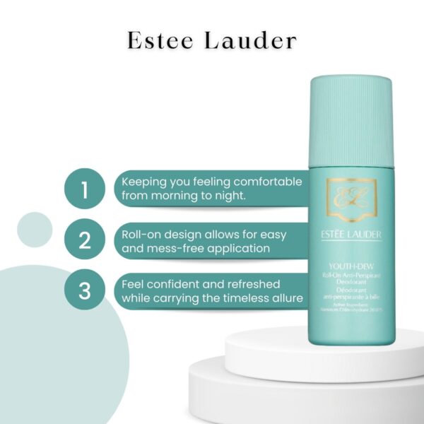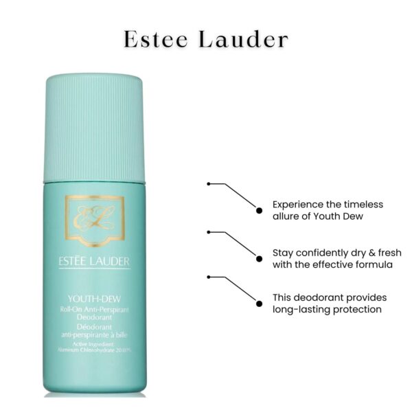 Youth-Dew is simply the sexiest fragrance ever. Absolutely captivating, with opulent flowers, rich spices, precious woods. In 1953, Estée Lauder introduced Youth-Dew as a scented bath oil that doubled as a perfume–and the world of fragrance was forever changed. Until then, women had relied on the men in their lives to give them perfume as a special gift. But Youth-Dew was created for women to buy for themselves…and they did. Even today, its captivating, sexy spiciness ensures that this true classic remains a favorite. The Roll-On Anti-Perspirant Deodorant glides on smoothly and comfortably, without whitening. Provides effective yet gentle protection against wetness and odor.