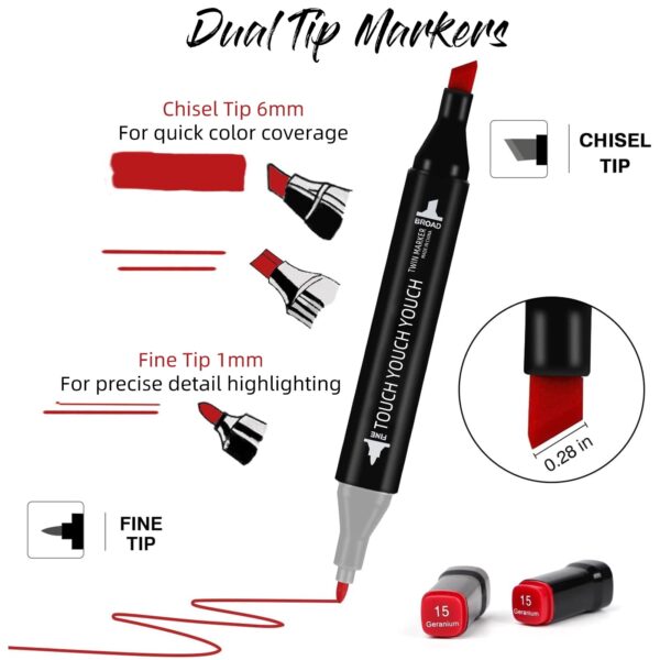 - [DUAL-TIP ALCOHOL MARKER] These alcohol based markers feature a dual-tip design, including a 1mm fine tip and a 6mm chisel tip. You can use the fine tip for precise highlights, sketching, and fine lines, while the chisel tip allows for quick large-area coloring and draw bold line. They effortlessly cater to various drawing needs, boast a larger ink capacity compared to other markers, and provide long-lasting ink flow.