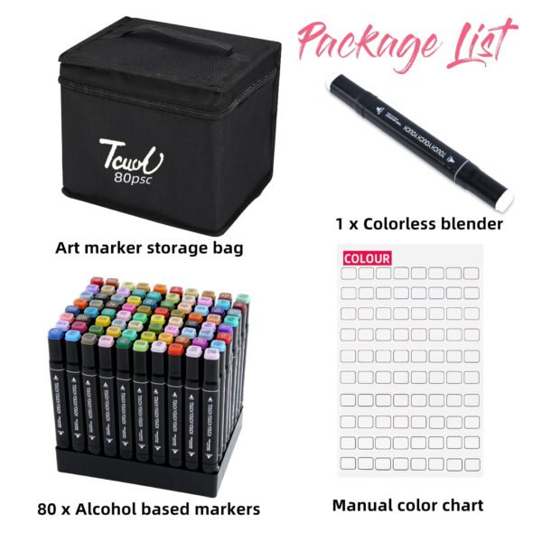 - [HIGH-QUALITY ART MARKERS] Our alcohol marker set includes 80 vibrant markers along with 1 bonus colorless blender. They offer high pigmentation, smooth laydown, easy blending, quick-drying ink, smear resistance, and fade resistance. By layering different colors, you can easily create an infinite range of color combinations. The uniquely ergonomic triangular barrel ensures comfort and a non-slip grip.
