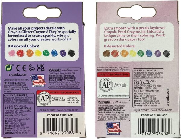 Discover the vibrant and sparkly world of Crayola Glitter and Pearl Crayons. This 8-count set features a variety of assorted colors, ranging from red to black/brown, that are perfect for adding a touch of glitz and glamour to your creative projects. The pearly crayons offer a smooth, lustrous finish, while the glitter crayons dazzle with their vibrant, shimmering hues. Suitable for all ages, these high-quality crayons are a must-have for any art enthusiast or budding artist. You’ll get one of glitter crayons and one box of pearl.