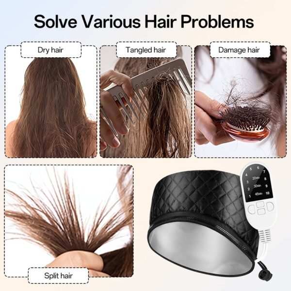 Experience salon-quality hair care at home with the RUTAWZ Hair Steamer Cap. This adjustable thermal cap features 10 temperature levels and 3 timer settings to deeply nourish your hair, reduce frizz, and enhance hydration. Suitable for all hair types, it helps improve hair health and growth. Includes a reusable shower cap for added convenience.