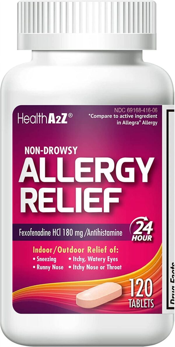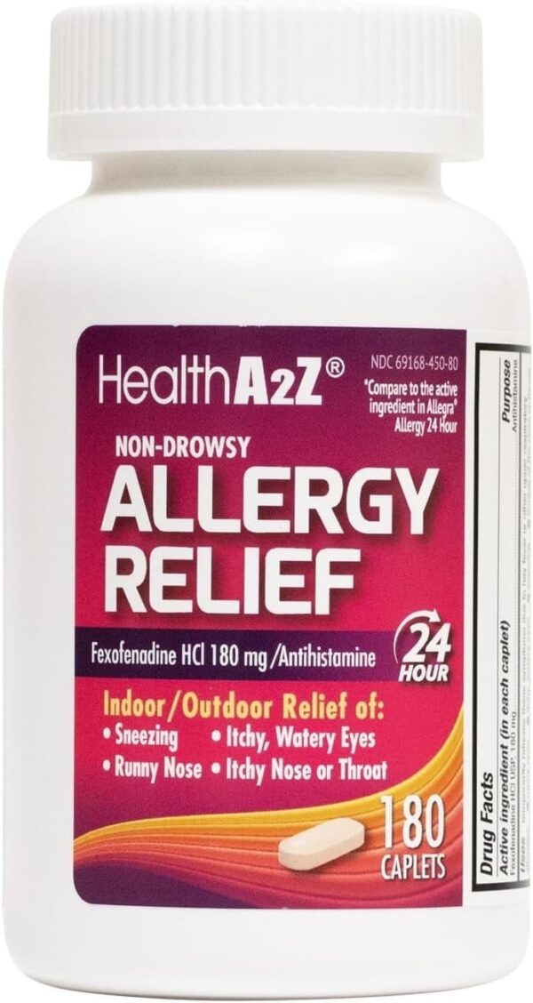HealthA2Z Allergy Relief, Fexofenadine HCl 180mg provides 24 hour indoor and outdoor allergy relief. Fexofenadine HCl antihistamine blocks the bodies allergic responses. Provides relief from hay fever or other upper respiratory allergies. Helps relieve runny nose, itchy, watery eyes, sneezing, and itchy nose and throat. Active ingredient (in each tablet): Fexofenadine HCl 180mg