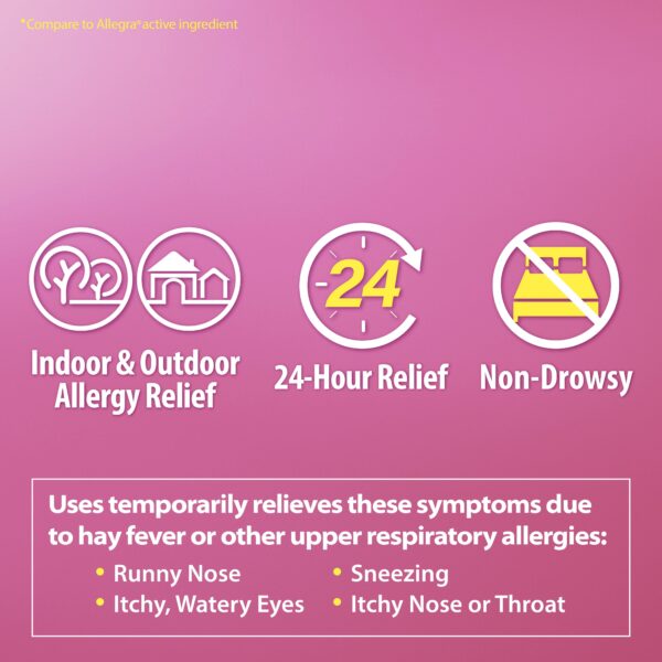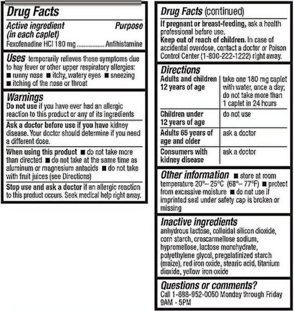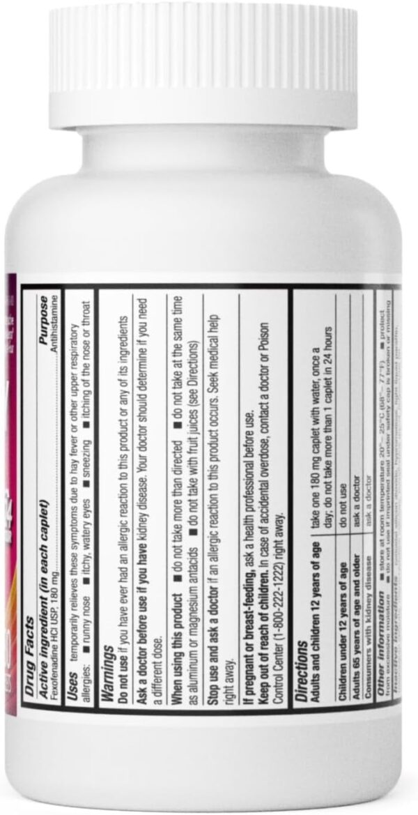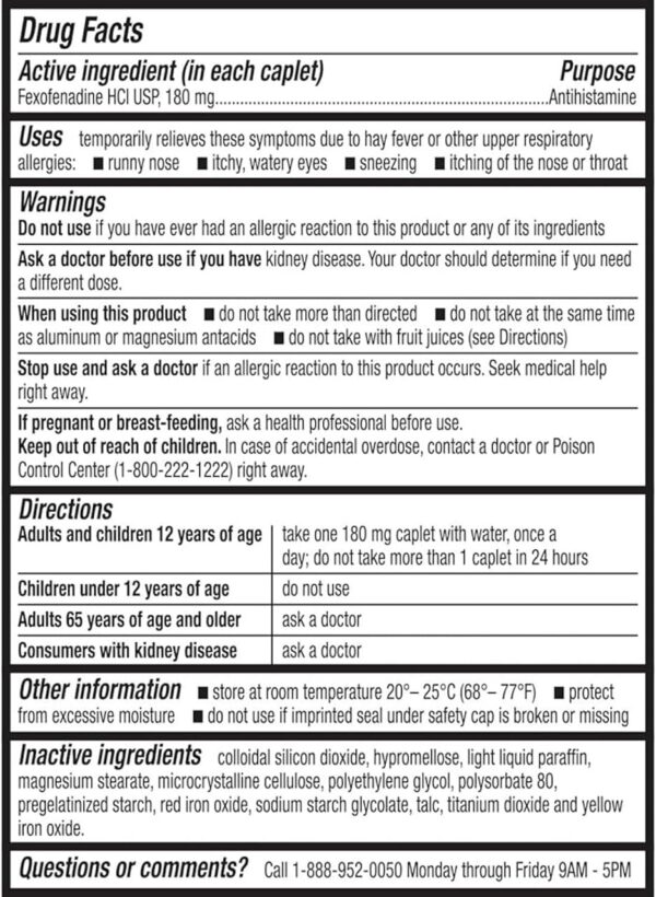 The active ingredient (fexofenadine HCI 180 mg) which is the same as Allegra, works well for my 88 year old that has runny nose and watery eyes due to the pollen. Seems to work all day like the package says. Doesn’t make him drowsy which is a good thing. Highly recommend it especially since it’s way cheaper than Allegra.
