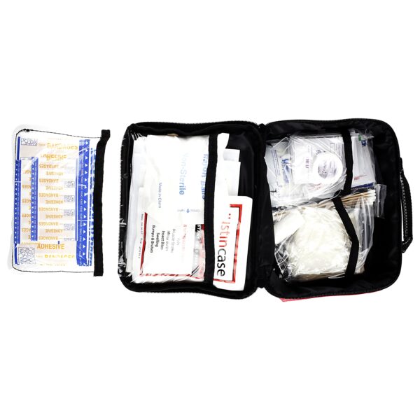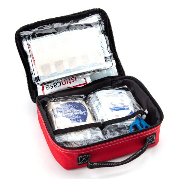 I like that the case has a handle and it zippers up so contents don’t fall out. I like that it’s red and easily visible. What I don’t like is that there are only 4 clear vinyl pockets and when you open up the case the items don’t seem to stay in well. I added regular size antibiotic cream, anti itch cream, burn gel, and aspirin because the tiny packets are just ok and hard to read what is what.