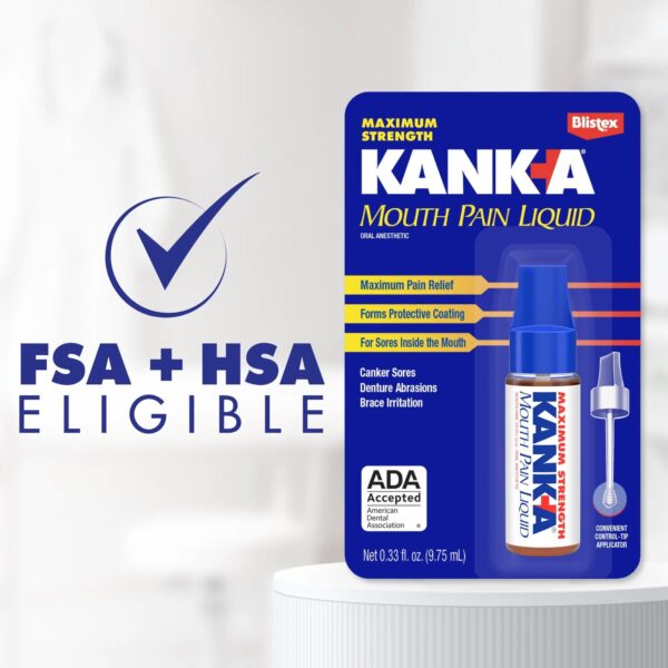 Kank-A Mouth Pain Liquid is the complete solution for canker sores and other mouth sores. It starts with maximum-strength benzocaine for instant, temporary pain relief. Kank-A Mouth Pain Liquid forms a long-lasting barrier that holds the anesthetic in contact with the sore and acts as a barrier against further irritation. It includes a convenient integrated control-tip applicator for accurate, mess-free application. Because of Kank-A Liquid’s effectiveness for temporary relief of pain due to mouth sores, it has been accepted by the American Dental Association. Recommended for Adults. Children under 12 years of age should be supervised in the use of this product. Children under 2 years of age: consult a dentist or doctor.