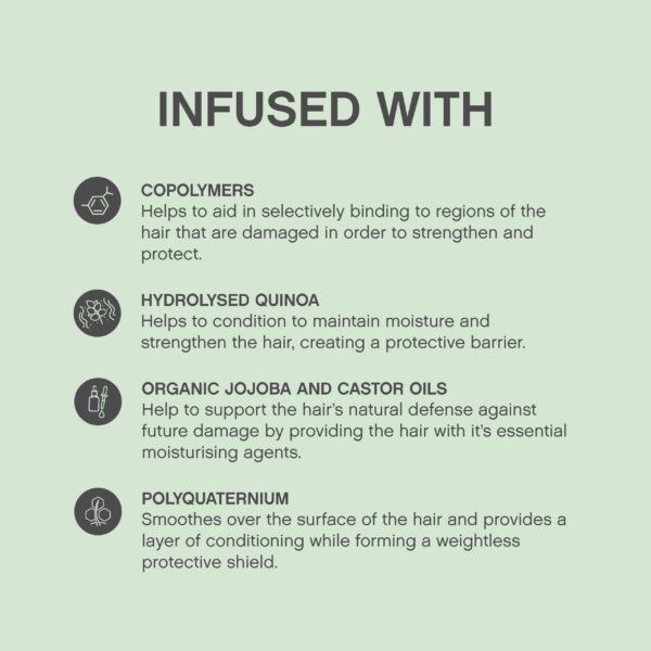 - Jojoba Seed Oil and Hydrolyzed Quinoa help prevent breakage