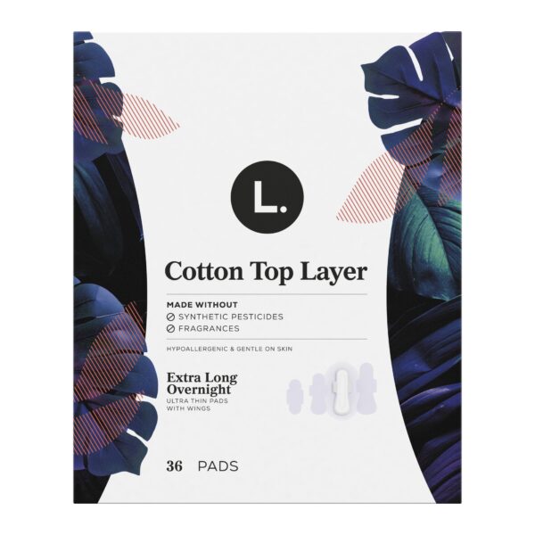 - L. Ultra Thin Pads, Overnight Absorbency, Organic Cotton Top Layer, Unscented Pads with Wings, 36 Count