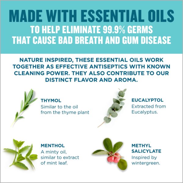 Protect your mouth from germs and get fresh breath with the Listerine Cool Mint Antiseptic Mouthwash. Accepted by the American Dental Association (ADA), this germ-killing mouthwash for bad breath is clinically shown to reduce plaque 52 percent more and reduce gingivitis 21 percent more than brushing and flossing alone. Adding a 30-second rinse of this refreshing mint flavored oral rinse to your morning and evening oral hygiene routines is all it takes to get 24-hour germ protection against those that cause bad breath, plaque, and gingivitis. From the #1 dentist recommended brand** of over the counter mouthwashes, Listerine Cool Mint Antiseptic Mouthwash contains the antiplaque and antigingivitis ingredients eucalyptol, menthol, methyl salicylate and thymol. *Germ kill provides sustained plaque reduction after a dental cleaning. Rinse is not intended to replace brushing or flossing. Use product only as directed. *when used twice daily **IQVIA survey May 2022-2023