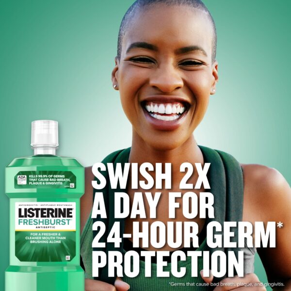 Protect your mouth from germs and get fresh breath with Listerine Freshburst Antiseptic Mouthwash for bad breath. It kills 99.9% of germs that cause bad breath, plaque, and gingivitis for a fresher and cleaner mouth than brushing alone. Clinically shown to reduce 52 percent more plaque and 21 percent more gingivitis than brushing and flossing alone, this antiseptic mouthwash provides a deep clean that cares for your whole mouth. Listerine Freshburst Mouthwash is a recipient of the ADA Seal of Acceptance for fighting, preventing, and reducing plaque and gingivitis. The great tasting Freshburst spearmint flavor of this antiseptic mouthwash leaves your mouth feeling clean and fresh. Achieve maximum results by rinsing with this refreshing oral rinse for 30 seconds twice a day, both morning and night, for 24-hour germ protection. *when used twice daily