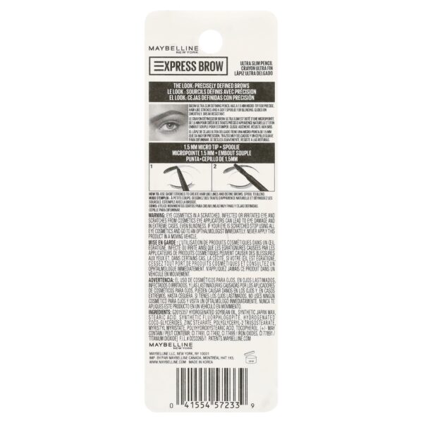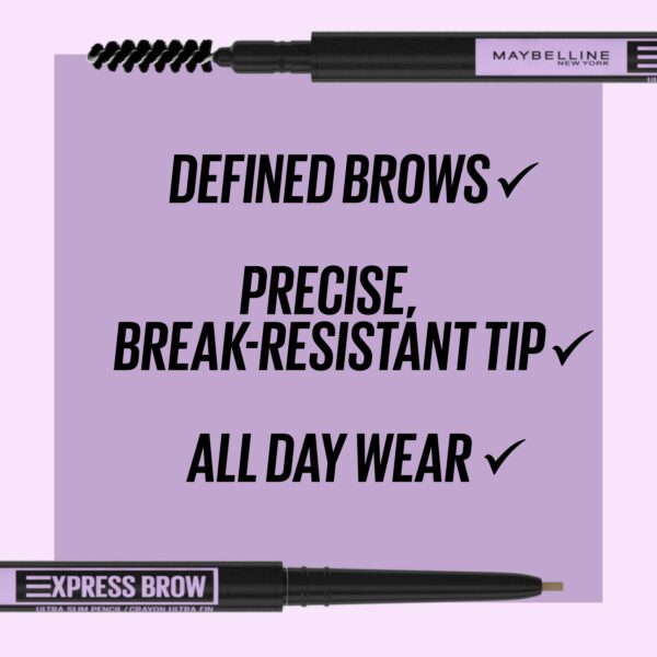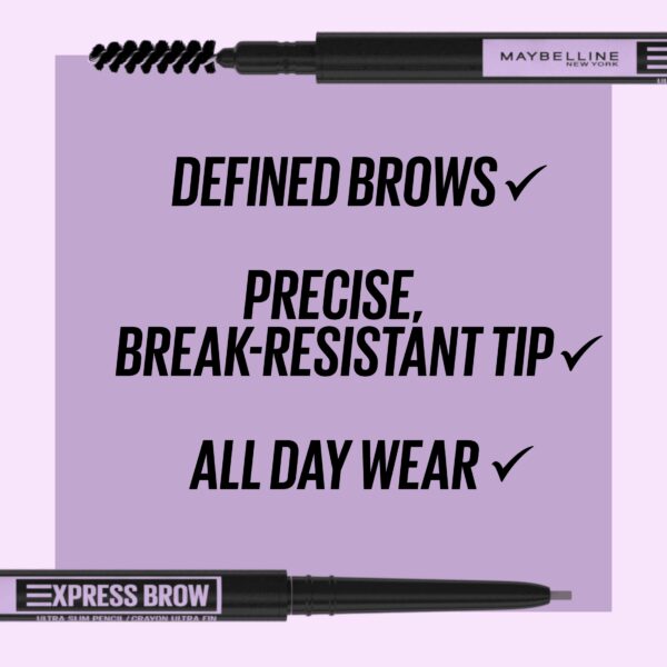 Maybelline Express Brow Ultra Slim Pencil Eyebrow Makeup, Deep Brown, Take the express to precisely shaped brows. Meet Maybelline New York’s Express Brow Ultra Slim Pencil. It’s the foolproof way to enhanced and defined brows, so you can say goodbye to sparse looking eyebrows and hello to filled, natural-looking eyebrows. Thanks to its break-resistant formula and built-in spoolie brush, this ultra fine eyebrow pencil creates precisely defined brows without skipping or tugging. Get your ticket to effortless application and express precision. Available in seven brow shades. Ophthalmologist tested. Suitable for contact wearers.