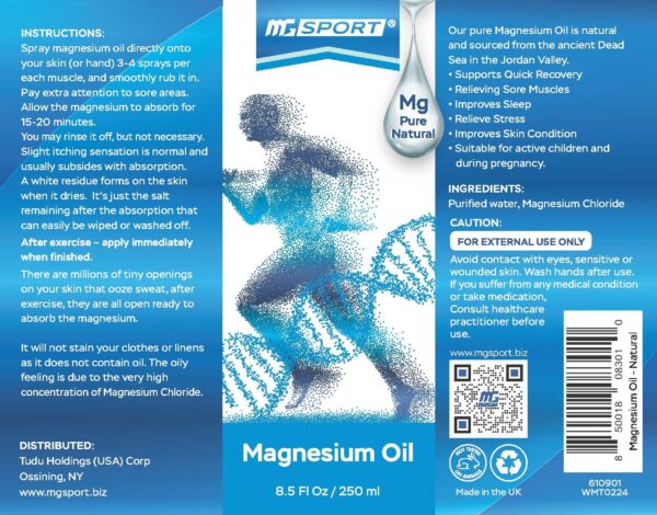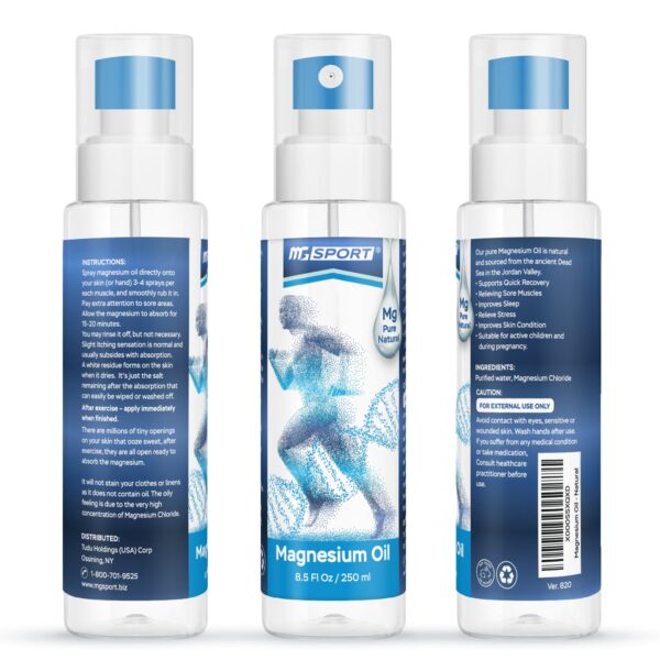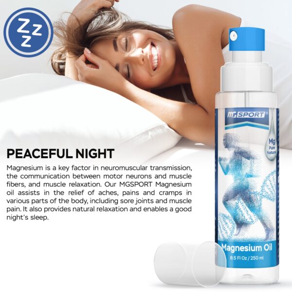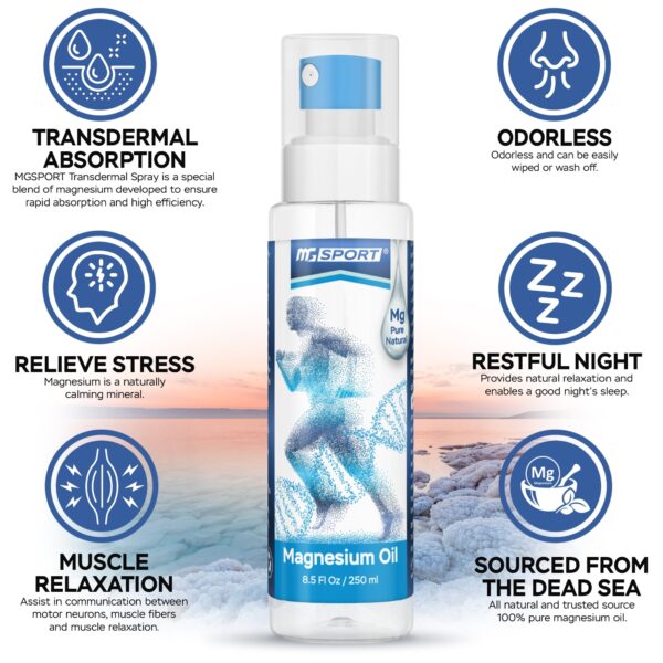 MGSPORT Magnesium Liquid Spray for Muscle Cramp, Bone & Joint Health, Sleep Support, 8.5 fl oz provides natural relief with its pure magnesium chloride formula sourced from the Dead Sea. This preservative-free spray helps alleviate muscle aches, joint pains, and leg cramps while promoting relaxation and improving sleep quality. Ideal for addressing Restless Leg Syndrome, this high-absorption magnesium solution is easy to apply topically, ensuring efficient absorption for enhanced wellness. Experience the rejuvenating benefits of MGSPORT Magnesium Liquid Spray today.