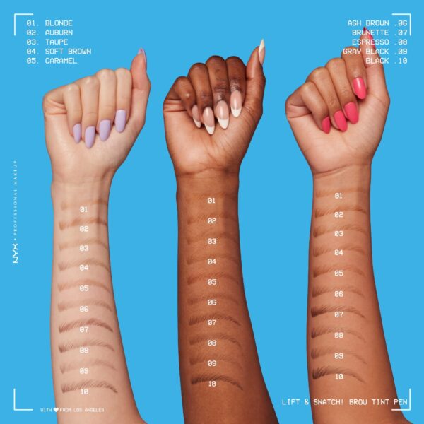 NYX Professional Makeup Lift N Snatch Brow Tint Pen is a flexible micro-brush tip pen allowing you to create thin to thick lines resembling natural brows. Create brows from nothing, fill in sparse areas, or build on top of your already snatched brows. Up to 16 hour wear: smudge-resistant and transfer-resistant so your eyebrows stay snatched!