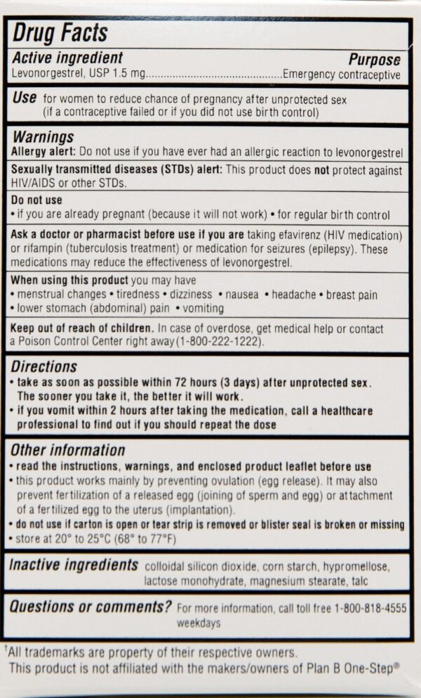 - Trusted Formula: Our product is formulated to provide the same active ingredient found in Plan B One-step, offering comparable effectiveness and trusted relief for your needs.