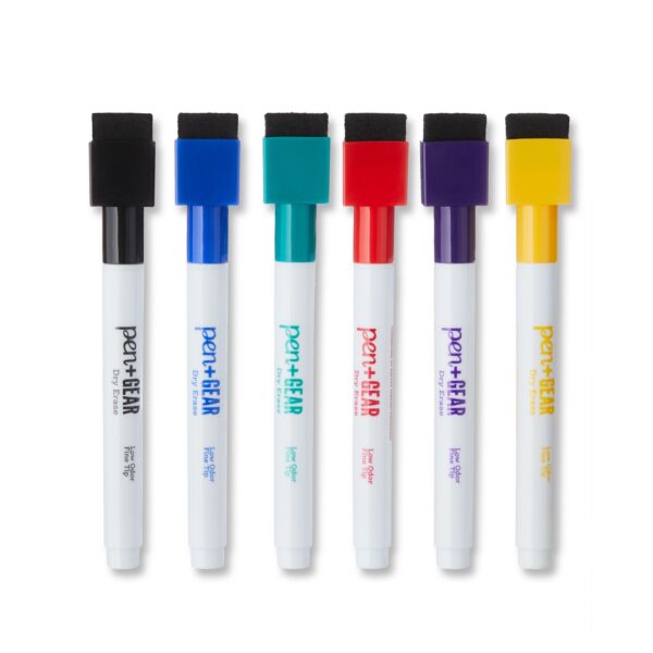 Pen+Gear Magnetic Dry Erase Markers with Eraser, Assorted Ink Colors, Fine Tip, 6 Count