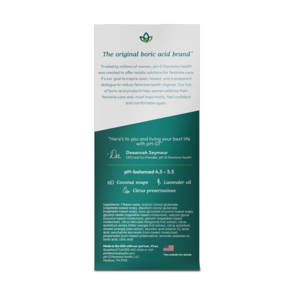 pH-D Feminine Health’s plant-based Boric Acid Sensitive Foam Wash is the original boric acid foam wash on the market. It is specially formulated to match the pH of your vulva making it gentle enough for daily use. Cleanse your whole body including your most sensitive areas. This product is unscented and intended for Women’s Health. From the #1 Doctor recommended brand of boric acid vaginal suppositories