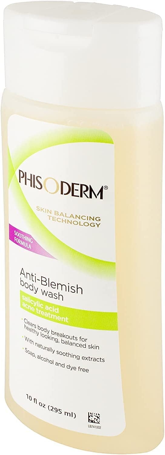 Phisoderm Anti-Blemish Body Wash 10 Oz (295 Ml – Soothing acne-fighting formula treats and helps prevent body breakouts while it washes away dirt and oil This medicated, gel body wash treats and helps prevent acne blemishes on the body and face. It rinses easily and leaves no residue or tightness. Designed with Skin Balancing Technology, pHisoderm Anti-Blemish Body Wash gently cleanses and calms, without disrupting the skin’s natural protective balance. With 2% salicylic acid acne medicine plus skin-soothing Vitamin E, Aloe, and Chamomile, and a fresh revitalizing fragrance for clean and clear skin all over. Fight acne while you shower with pHisodermR Anti-Blemish Body Wash. Formulated for oily and acne-prone skin, this soothing body wash for acne is pH-balanced with Skin Balancing Technology to cleanse dirt and oil without disrupting your skin’s natural protective balance. Skin-soothing vitamin E, aloe, and chamomile, and a fresh revitalizing fragrance, create a pampering experience. This anti-acne body wash contains 2% salicylic acid acne treatment to clear up acne-prone skin.